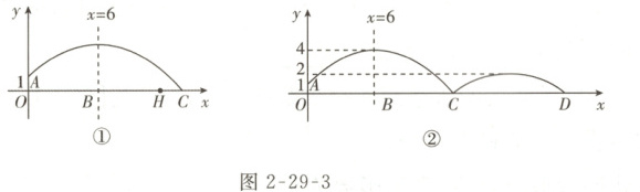 (4) 如图 2 - 29 - 3②,在(2)的情况下,若球落地后又一次弹起,据实验测算,足球在草坪上弹起后的抛物线与原来的抛物线形状相同,最大高度减少到原来最大高度的一半,则足球弹起后,会弹出多远?(结果保留整数)