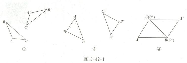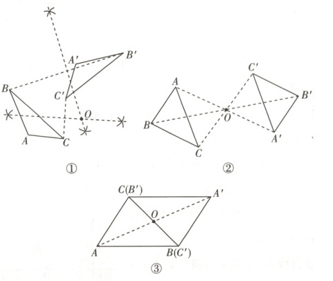 01 △ABC 与△A'B'C'是全等三角形,那么△A'B'C'可以看作是由△ABC 以 O 为旋转中心旋转一定角度所得到的,在图 3 - 42 - 1 中画出三组图形的旋转中心。(画图过程请用虚线)