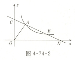02 如图 4 - 74 - 2,直线 $ AB:y_1 = kx + b(k \neq 0) $ 交坐标轴于点 $ C $,$ D $,且与反比例函数 $ y_2 = \frac{n}{x}(x > 0) $ 的图象相交于点 $ A(m,3) $,$ B(m + 4,1) $。
