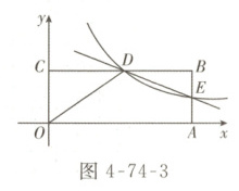 03 如图 4 - 74 - 3,在平面直角坐标系 $ xOy $ 中,矩形 $ OABC $ 的顶点 $ A $ 在 $ x $ 轴上,顶点 $ C $ 在 $ y $ 轴上,$ D $ 是 $ BC $ 的中点,反比例函数 $ y = \frac{m}{x} $ 的图象与直线 $ y = kx + b $ 相交于 $ D $,$ E $ 两点,若 $ OD = 5 $,$ OC = 3 $,解答下列问题。