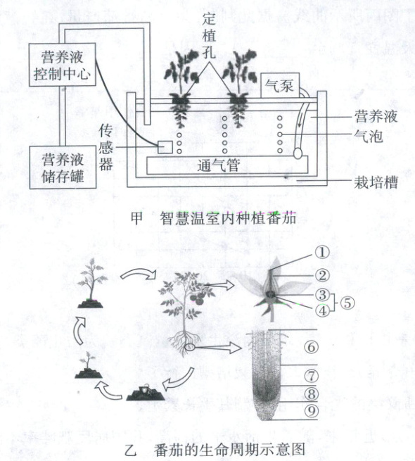 (7)技术人员研究番茄光合作用和呼吸作用速率与温度的关系,绘制了图丙所示曲线。据此判断:为提高番茄产量,在智慧温室内,白天温度宜调至