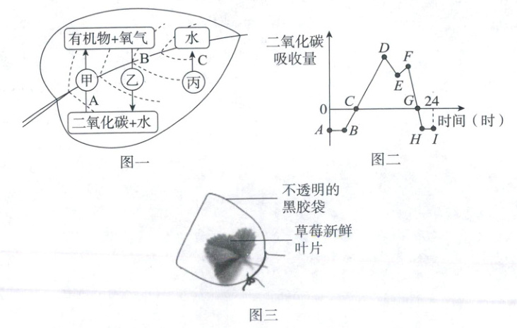 26. (8分)某校学生到草莓大棚种植基地开展实践活动,调查分析促进作物增产的常用方法。图一表示草莓的部分生理活动示意图(A、B、C代表生理活动,甲、乙、丙代表活动发生的部位);图二表示夏季晴天一昼夜二氧化碳吸收量的变化情况;图三表示探究某生理活动的实验装置。请据图回答: