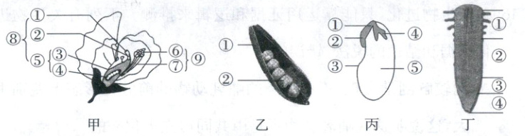 大豆起源于中国,已有4000余年的种植历史。宋代医书《延年秘录》记载:“服食大豆,令人长肌肤,益颜色,填骨髓,加力气……”图甲、乙、丙、丁分别为大豆的花、果实、种子、根尖结构示意图,请完成6,7题。