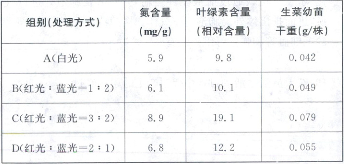 (3)由题干可知,本实验目的是研究不同光质配比对生菜幼苗的氮含量、叶绿素含量及生菜幼苗干重的影响,且题干明确其他因素相同且适宜,根据控制变量法,实验中控制的唯一变量是不同光质配比。