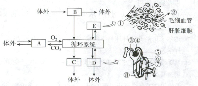 和肾小囊内壁的滤过作用进入肾小囊腔,再由⑧全部重吸收进入血液。(2) 航天员执行任务时消耗的能量主要由葡萄糖提供。已知肝脏中的糖原和葡萄糖的相互转化在肝脏细胞中完成,若E表示肝脏,则饥饿状态下流经肝脏的血液中葡萄糖浓度②处