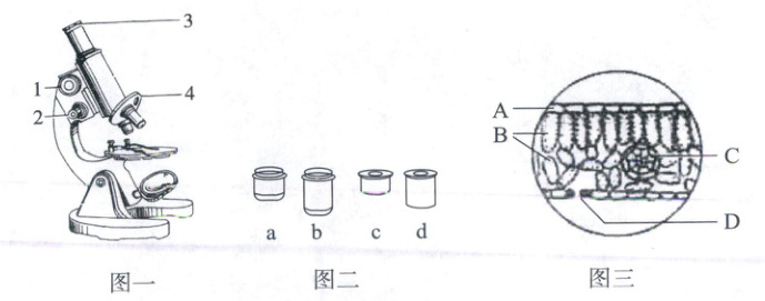 (2)由图二可知,a、b有螺纹为物镜,c、d无螺纹为目镜。物镜倍数越高,镜头越长;目镜倍数越高,镜头越短。因此观察临时切片时,要使视野范围最大,应选用图二中的a、d;若物像模糊不清,应转动图一中的2细准焦螺旋,使物像更清晰。