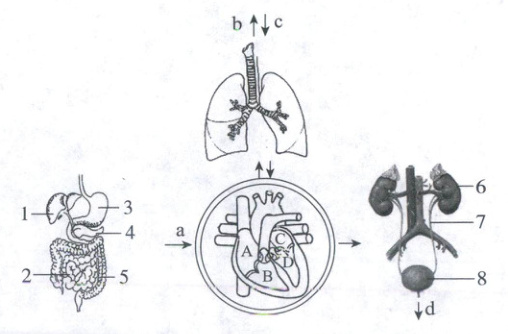 (1)1肝脏是人体最大的消化腺,它分泌的消化液对脂肪有乳化作用;图中a过程为吸收过程,能进行营养物质吸收的器官有2小肠、3胃和5大肠;营养物质进入血液后,经过体循环,由下腔静脉到达右心房,进入右心室,经肺循环到达左心房,然后进入左心室,经体循环运输到达组织细胞[重难点],因此营养物质到达组织细胞的过程中,经过心脏四腔的先后顺序是A(右心房)→B(右心室)→C(左心房)→D(左心室)。