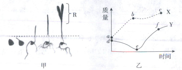 7. 甲图表示玉米种子萌发过程,乙图是在这一过程中的鲜重和干重(有机物)变化曲线。下列叙述正确的是(