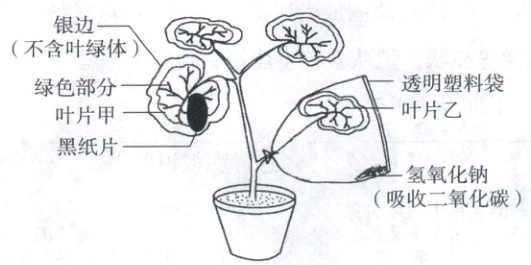 5. 将在黑暗处放置一昼夜的银边天竺葵进行如图处理后,移到光下照射3小时左右,摘下叶片甲和乙,经脱色、漂洗后滴加碘液,观察实验现象。该实验不能验证(