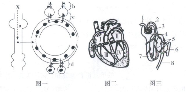 28. (10分)学校举行运动会,小明报名参加长跑项目。妈妈为他准备了早餐,有面包、牛奶、咸鸭蛋、油条。如图是人体部分结构与功能示意图,图中a~d表示生理过程,Ⅰ~Ⅳ表示心脏各腔,1~8表示结构。据图回答问题([ ]内填字母或编号):