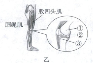 ③运动时要做好防护,如佩戴护膝。护膝可将关节牢固包裹起来,避免关节受伤,它与图乙关节结构中的[ ]_______作用相似。结合图乙分析,由屈腿到伸腿过程中,下肢肌肉中股四头肌的状态变化是_______。