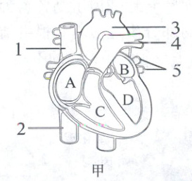 (2)①若因肺动脉内脂类物质的堆积等原因导致血管狭窄,进入肺部的血液量会减少,这将影响肺泡与血液的气体交换。②脑干是人体调节心跳和呼吸频率的神经中枢;氧气从进入血液到输送给骨骼肌细胞的过程中,经过图甲中各结构的最短路径是5(肺静脉)→B(左心房)→D(左心室)→3(主动脉)→骨骼肌周围的毛细血管网→骨骼肌细胞。③护膝可将关节牢固包裹起来,避免关节受伤,它与图乙关节结构中的[②]关节囊作用相似;屈腿时股四头肌舒张,伸腿时股四头肌收缩。因此由屈腿到伸腿过程中,下肢肌肉中股四头肌的状态变化是由舒张变为收缩。④除适当运动外,心血管疾病还可通过合理膳食,减少高脂肪、高胆固醇食物的摄入等进行预防。