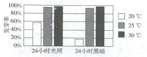 11.D【解析】种子萌发的实验设计 实验所用种子选择粒大饱满的,可保证种子自身具备萌发的良好基础,且种子数量不能过少,避免偶然因素对实验结果的影响,提高实验准确性,A正确;种子萌发过程中,胚根最先突破种皮发育成根,随后胚轴伸长、胚芽发育成茎和叶,B正确;从实验结果可知,在一定温度范围内,随着温度升高有利于种子萌发,C正确;由实验数据可知,24小时黑暗环境下种子仍然可以萌发,说明光照不是该植物种子萌发的必需条件,D错误。