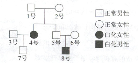 思路分析 由图可知,白化病致病基因为隐性基因,假设用a表示,A表示显性基因。4号是白化病患者,其基因组成为aa,其白化基因来自表型正常的1号和2号,则可推出1号和2号的基因组成都为Aa;8号是白化病患者,同理可得5、6号的基因组成都为Aa,5号的a来自1号或者2号;7号正常,3号正常,4号(aa)为白化病患者,3号基因组成为AA或Aa,所以7号基因组成一定是Aa,与2号相同。