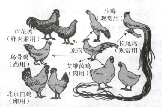 16. 在生产实践中,人们通过对原鸡长时间的人工选择,培育出了卵肉兼用的芦花鸡、药用的乌骨鸡、卵用的北京白鸡、肉用的艾维茵鸡、观赏用的长尾鸡和斗鸡等不同品种(如图)。下列说法错误的是(