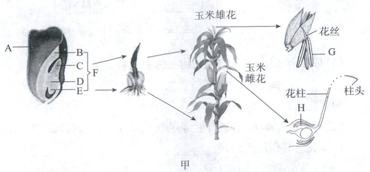 (1)图甲中,F为种子的胚,包括B子叶、C胚芽、D胚轴和E胚根,种子萌发需要完整的胚,粒大饱满、没有缺损的玉米籽粒能确保图甲中F胚的结构完整;玉米属于单子叶植物,淀粉主要储存在玉米籽粒中的A胚乳处。