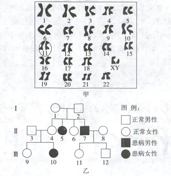 31. (6分)白化病是一种由位于11号染色体上的某基因发生改变而引起的遗传病,主要表现为皮肤、毛发缺少色素。图甲为某男性体细胞的成对染色体排序图,图乙是该男子家族白化病遗传系谱图。请据图分析回答下列问题。(显隐性基因分别用A、a表示)