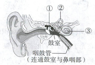 13. D【解析】耳与听觉 ①是听小骨,把雷声转为机械性振动的是鼓膜,A错误;②是半规管,感受雷声刺激并产生神经冲动的是③耳蜗,B错误;③是耳蜗,判断雷声部位的是大脑皮层的听觉中枢,C错误;遇到打雷时,张开嘴或捂住耳朵可以保持鼓膜内外气压平衡,防止鼓膜受损,D正确。