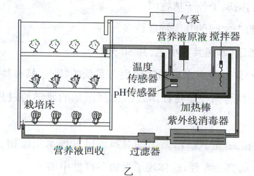 (5)由图乙可知,植物工厂能精准控制温度、pH等条件,还能通过气泵等设备为植物提供充足的二氧化碳,并且有多层栽培床,能充分利用空间,增加种植面积,同时,可精准调控营养液成分,为植物生长提供更适宜、更充足的营养,这些都有利于植物进行光合作用,从而促进作物增产。