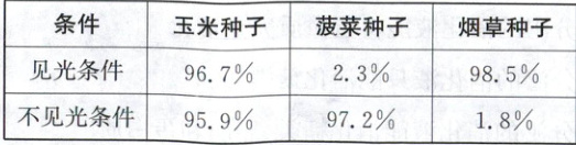 29. 如表是玉米、菠菜和烟草种子在见光和不见光条件下的发芽率,根据该表推测,播种时需要深埋的种子是(