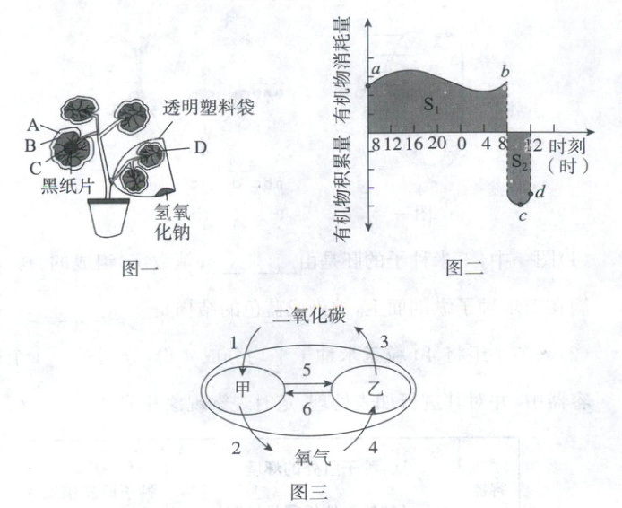 28. (9分)某兴趣小组在学习了“验证绿叶在光下制造淀粉(有机物)”的实验后,又利用银边天竺葵(叶片边缘部分的细胞中无叶绿体)进行实验:图一为实验设计(A、B、C、D代表叶片的不同部位,氢氧化钠能够吸收二氧化碳);图二表示实验过程中该植物消耗和积累有机物的情况(从上午8时至第二天上午8时将该植物放在黑暗处进行暗处理,然后移到光下照射4小时);图三为该植物某叶肉细胞内进行的生理活动(1~6表示生理过程,甲、乙代表细胞结构)。请据图分析回答下列问题: