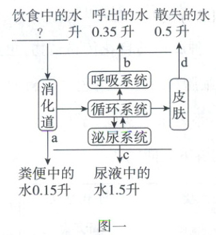 (1)人体通过饮食摄入的水主要在消化道的小肠被吸收,小肠是吸收营养物质的主要场所;排泄是指人体将二氧化碳、尿素以及多余的水和无机盐等排出体外的过程。图一中,b是二氧化碳和少量水通过呼吸系统排出,c是大部分水、无机盐、尿素等以尿液形式通过泌尿系统排出,d是少量水、无机盐和尿素以汗液形式通过皮肤排出,都属于排泄途径。a是排出食物残渣中未吸收的水,属于排遗,不属于排泄。