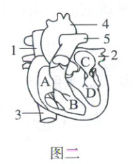 (2)吸收的水进入血液后,首先经过图二中的[3]下腔静脉血管进入心脏,然后依次经过A右心房→B右心室→5肺动脉→2肺静脉→C左心房→D左心室→4主动脉→各级动脉。