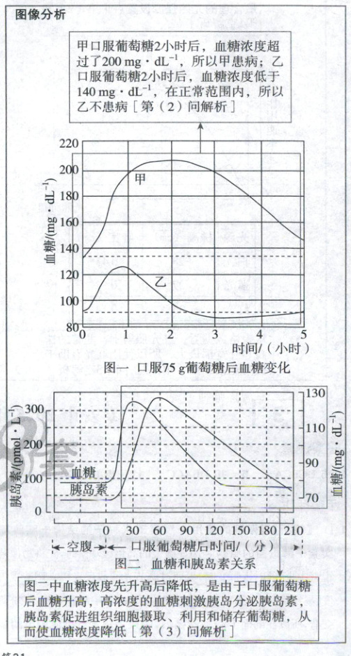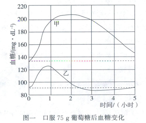 (2)口服葡萄糖监测血糖变化可以用于糖尿病诊断,正常情况下,空腹口服 75 g 葡萄糖 2 小时后的血糖浓度要低于 140 mg·dL⁻¹,如果 2 小时后或其他任何时间血糖浓度超过 200 mg·dL⁻¹,可认定糖尿病。据此分析图一的甲、乙两人患病情况:甲_______,乙_______(均填“患病”或“不患病”)。