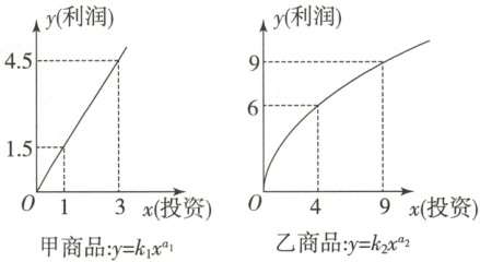 3. 某厂商计划投资生产甲、乙两种商品,经市场调研发现,如图所示,甲、乙商品的投资$x$与利润$y$(单位:万元)分别满足函数关系$y = k_1x^{a_1}$与$y = k_2x^{a_2}$。