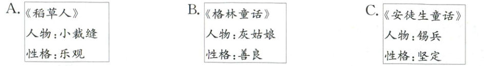 5. 小明读完《爱唱歌的方头蟋蟀》后,兴致勃勃地读了其他童话故事,并制作了三张童话人物卡片,有错误的一项是()。