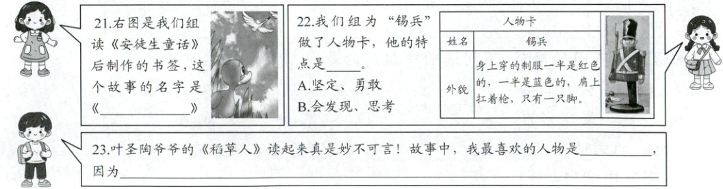 21.丑小鸭;22.A;23.稻草人,他非常善良,一心想帮助别人。