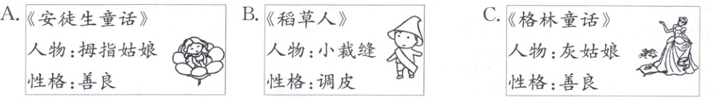 9. 小路同学喜欢童话故事,他制作了三个人物卡,有错误的是(
