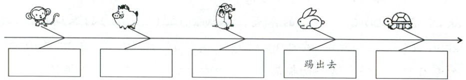 ③猴子说:“这么好的草地,弄得不像样子了!”猴子捡起罐头狠狠地扔了出去——罐头飞呀飞,最后“咚”的一声,砸(zá)到野猪的头上。