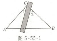01 如图 5 - 55 - 1,将三角尺与直尺贴在一起,使三角板的直角顶点 $ C(∠ACB = 90^{\circ}) $ 在直尺的一边上,若 $ ∠2 = 65^{\circ} $,则 $ ∠1 $ 的度数是