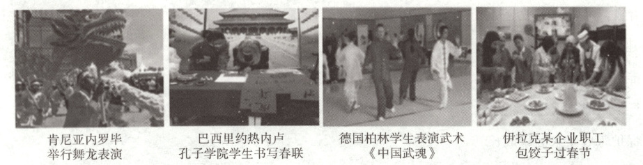 )①春节文化开始走向世界 ②中国春节,世界共享 ③春节是中外文化交流的桥梁 ④春节文化引领世界文化发展
