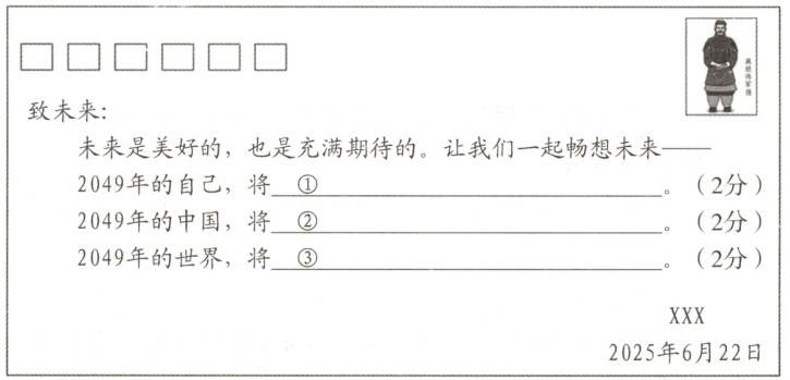(4)我们生在盛世,亦当不负盛世!让我们带着自信,带着憧憬,踏上新征程,向未来进发!请你完成“写给未来”的明信片。(6分)