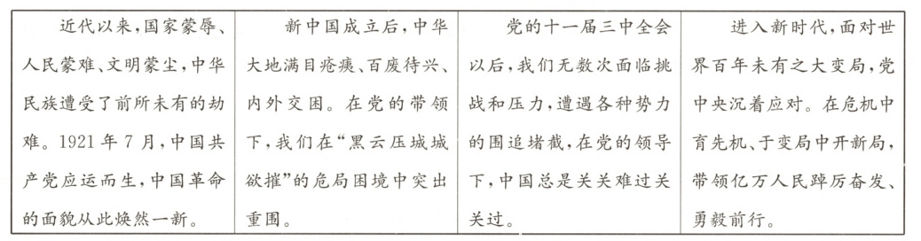 (3)请结合上述材料,运用相关学科知识,举例并论证中国共产党为什么值得信赖。(8分)