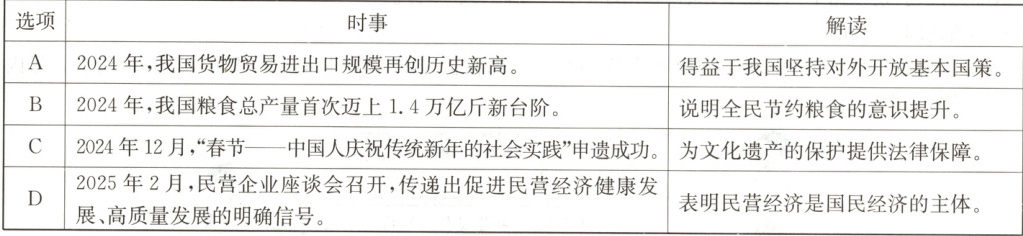 2.根据所学知识可知,我国贸易进出口规模再创新高得益于我国坚持对外开放基本国策,A正确;我国粮食总产量首次迈上1.4万亿斤新台阶,无法体现全民节约粮食的意识提升,B错误;“春节——中国人庆祝传统新年的社会实践”申遗成功,没有体现为文化遗产的保护提供法律保障,C错误;公有制经济(包括国有经济、集体经济及混合所有制中的国有成分和集体成分)是国民经济的主体,国有经济是主导力量,D错误。故选A。