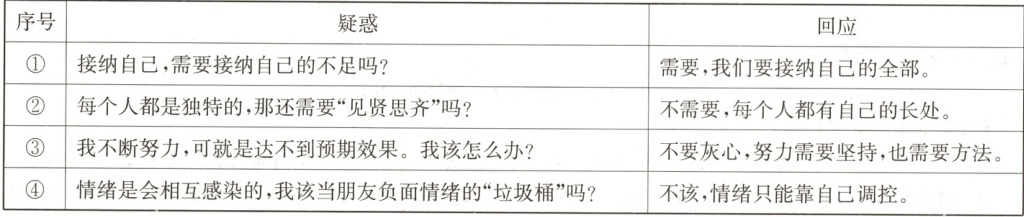 6.接纳自己,需要接纳自己的不足吗?需要,我们要接纳自己的全部,①正确;我不断努力,可就是达不到预期效果。我该怎么办?不要灰心,努力需要坚持,也需要方法,③正确;②每个人都是独特的,那还需要“见贤思齐”吗?需要,好的榜样昭示着做人、做事的基本态度,激发我们对人生道路和人生理想的思考,给予我们自我完善的力量;④错误,情绪是会相互感染的,我该当朋友负面情绪的“垃圾桶”吗?我们需要帮助朋友化解不良情绪。故选A。
