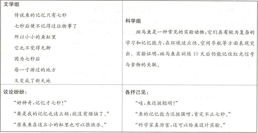 班级“文化角”里养了几条小金鱼,同学们兴趣十足,老师便提议召开关于“鱼”的主题分享会。经收集资料后,有兴趣小组就“鱼的记忆”进行了如下展示和讨论: