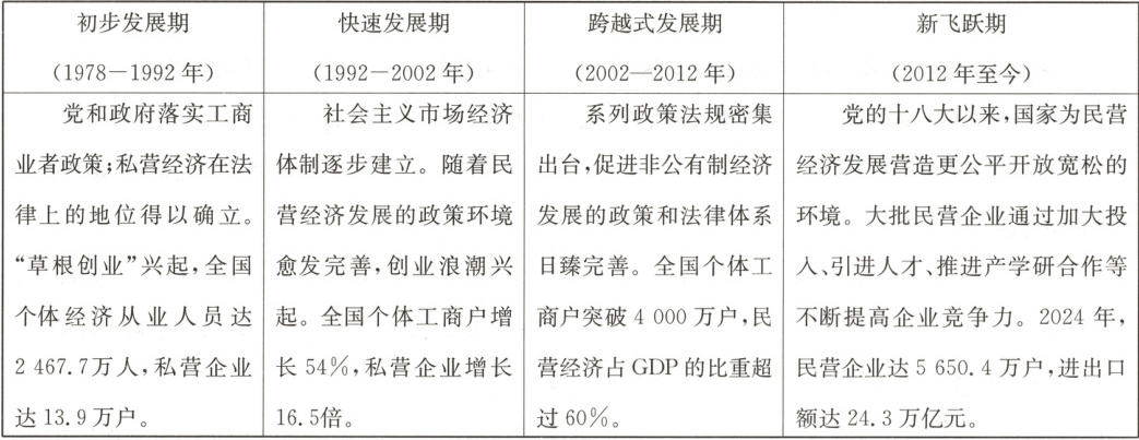 2025 年 2 月 17 日,习近平总书记在出席民营企业座谈会时强调:“新时代新征程民营经济发展前景广阔、大有可为,广大民营企业和民营企业家大显身手正当其时。”以下是我国民营经济发展历程的四个阶段。阅读材料,完成 8~9 题。