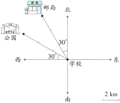 4. 植物园位于学校的东偏北35°方向4km处,请在图中画出来。(2分)