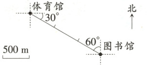 B.图书馆在体育馆的北偏西$60^{\circ}$方向 1500 m 处