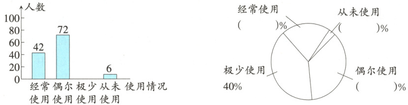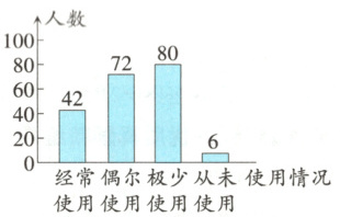4. 新情境AI使用情况调查2024年11月20日,教育部办公厅印发《教育部办公厅关于加强中小学人工智能教育的通知》。为了解老师和同学们对AI软件的使用情况,未来小学随机抽取了部分师生进行调查,调查的情况分为“经常使用”“偶尔使用”“极少使用”“从未使用”四种。根据调查所得到的数据结果绘制成了如下两幅不完整的统计图。