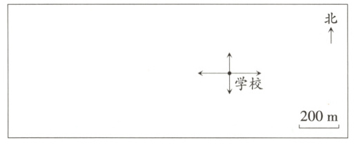 (1)向北方向与明明家到学校方向成$30^{\circ}$,水平向右东方向,明明家与学校水平距离$200m$的图上距离表示$200m$