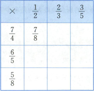 7.$\frac{7}{6}$ $\frac{21}{20}$ $\frac{3}{5}$ $\frac{4}{5}$ $\frac{18}{25}$ $\frac{5}{16}$ $\frac{5}{12}$ $\frac{3}{8}$ 发现:它们的乘积都相等。因为在$9$个乘积中选择$3$个既不同行、又不同列的数连乘,实际上就是$\frac{1}{2} × \frac{7}{4} × \frac{2}{3} × \frac{6}{5} × \frac{3}{5} × \frac{5}{8}$。