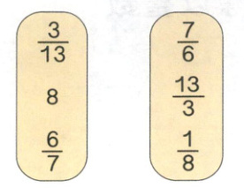 $ \frac{3}{13} $$ 8 $$ \frac{6}{7} $$ $$ \frac{7}{6} $$ $$ \frac{13}{3} $$ $$ \frac{1}{8} $$ $$ \frac{25}{26} $$ 100 $$ \frac{59}{99} $$ $$ \frac{1}{100} $$ $$ \frac{99}{59} $$ $$ \frac{26}{25} $