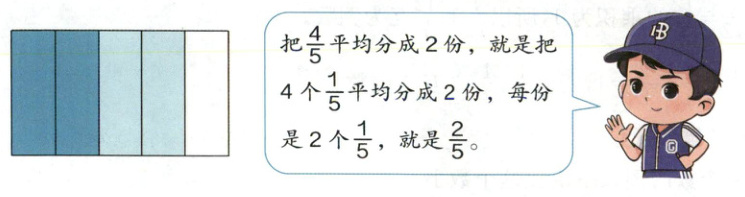 1 把一张纸的 $\frac{4}{5}$ 平均分成 $\boldsymbol{2}$ 份,每份是这张纸的几分之几?自己试着折一折,算一算。