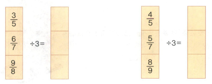 $\frac{1}{4} ÷ \frac{3}{5}$ $\frac{4}{5} ÷ \frac{8}{15}$ $\frac{1}{3} ÷ \frac{3}{4}$ $\frac{5}{14} ÷ \frac{10}{21}$