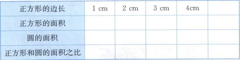 15. 下表中的圆是从正方形中画出的最大的圆,请根据它们的关系完成下表。